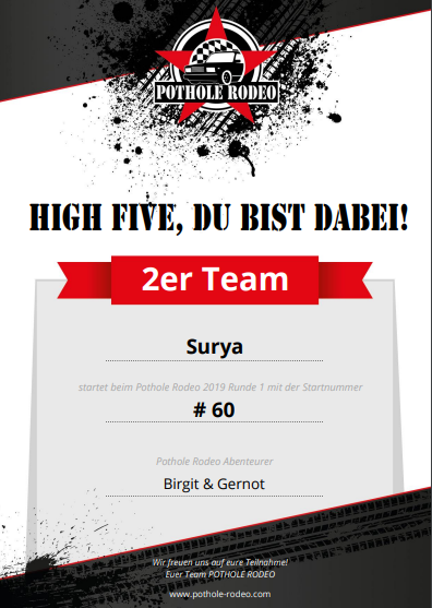 Es freut uns umso mehr, einen dieser begehrten Startplätze ergattert zu haben und dass wir bei dieser Benefiz-Rallye als „Team Surya“ starten werden. Merkt euch also gut die Nummer#60, denn diese wird unsere sein.