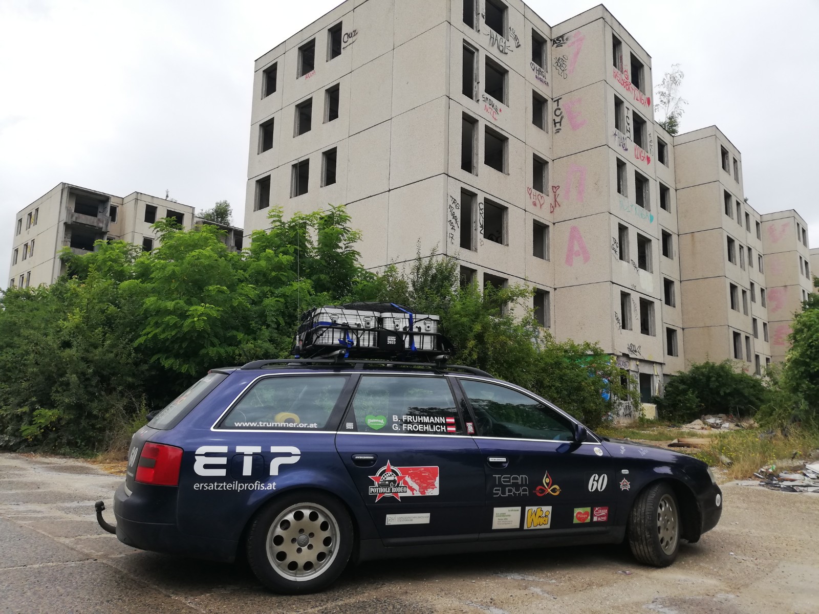 Wir haben uns für eine ruhige und gemächliche Route entschieden, die teilweise auch über Autobahnen führte. Als ersten Sightseeing-Point haben wir die Geisterstadt ohne Namen nahe Veszprem ausgesucht. Hier wollten wir dann auch unsere erste Tages-Challenge erfüllen (aber dazu gleich mehr). Es erwartet uns nämlich für jede Etappe eine Challenge, für die es Punkte abzustauben gilt. Bekanntlichermaßen geht es bei dieser Rallye ja nicht um Geschwindigkeit sondern es gibt einen Punktewertung im Hintergrund.