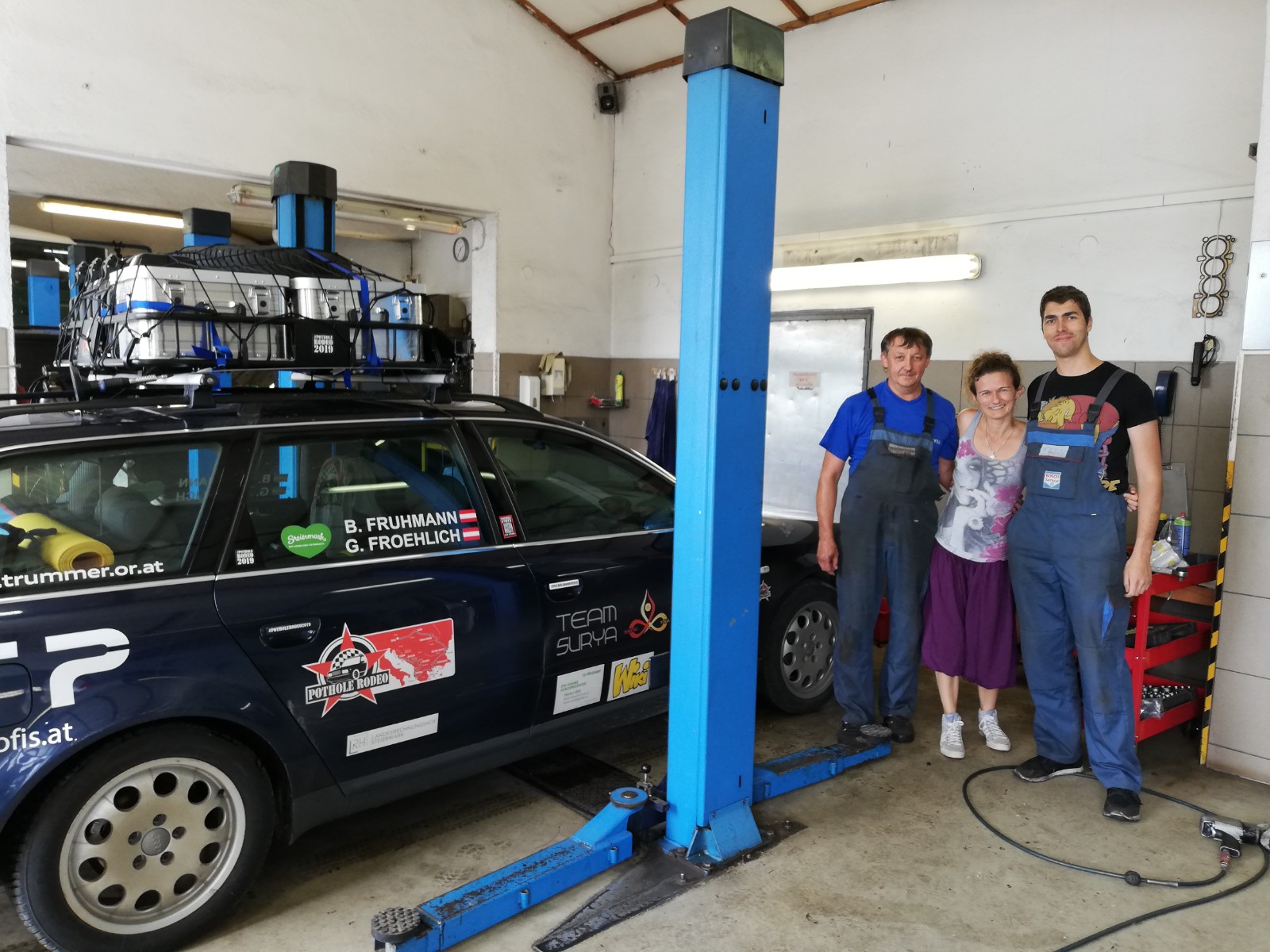 Zuerst wollten wir allein oder mit anderen Potholern unser Auto aufbocken. Auf Ziegelsteine oder was auch immer wir finden würden. In der Geisterstadt sind wir aber nicht fündig geworden, sodass wir kurzerhand eine Werkstatt in einem kleinen ungarischen Dorf aufgesucht haben. Einmal schnell auf die Hebebühne, Foto hochgeladen und die Aufgabe war erfüllt…