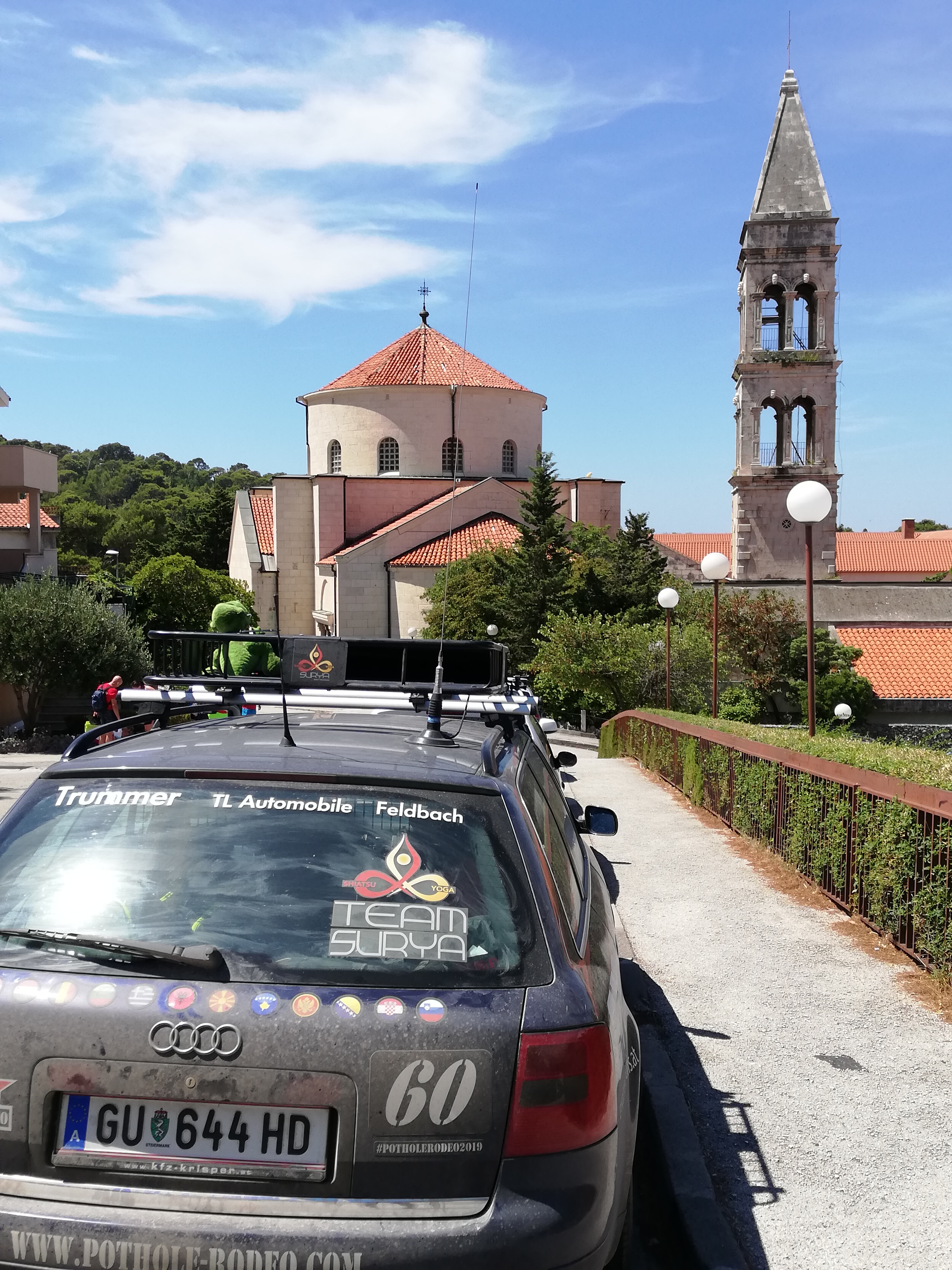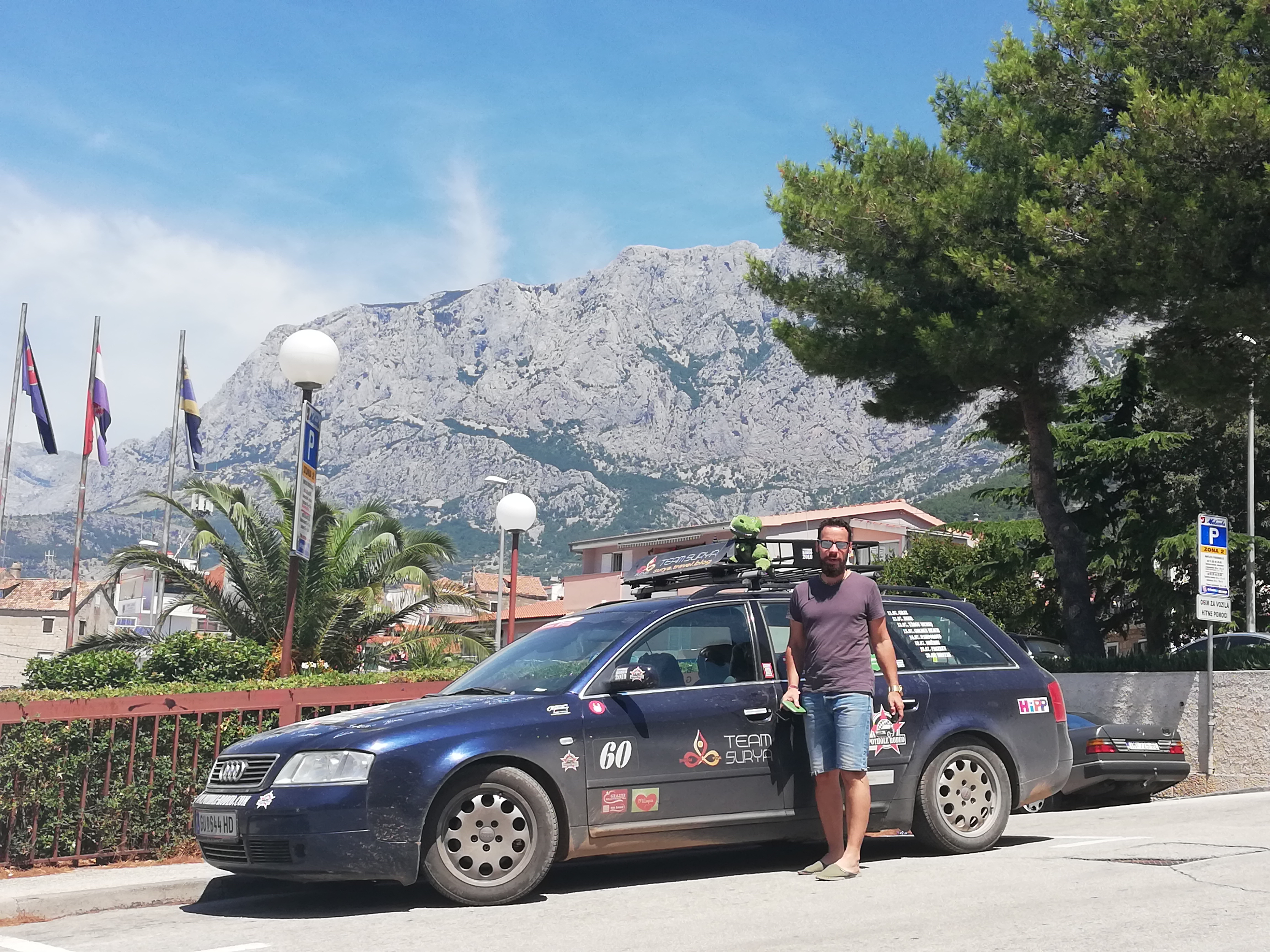 Auf dem Weg dorthin haben wir noch schnell unsere letzte Challenge erledigt. Es galt seinen Balkan Bruder zu finden, sprich ein baugleiches Modell von unserem Rallyeauto gemeinsam mit dem eigenen Auto zu fotografieren. Das Ganze am Besten noch mit original Balkan-Fahrer. Obwohl wir gestern den ganzen Tag nach einem A6 C5 Ausschau hielten, war keiner aufzutreiben. Und heute plötzlich war er da. Zwar ohne Fahrer, aber immerhin für ein paar Punkte gut.