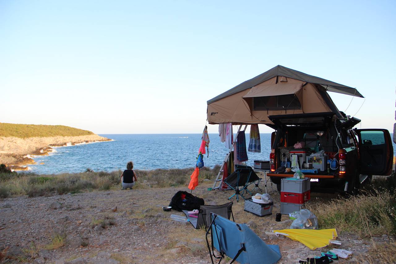 Die südlichste Halbinsel Luštica scheint uns die ruhigste der vielen Halbinseln zu sein. Viele Bauprojekte wurden hier gestartet, aber nie vollendet. An jeder zweiten Immobilie hängt ein For-Sale-Schild. Dabei hat gerade diese Seite eine Menge mystischer Bauten zu bieten. Zum Beispiel den „Tower of Arza“ an dem wir für heute Nacht unser Quartier aufgebaut haben.