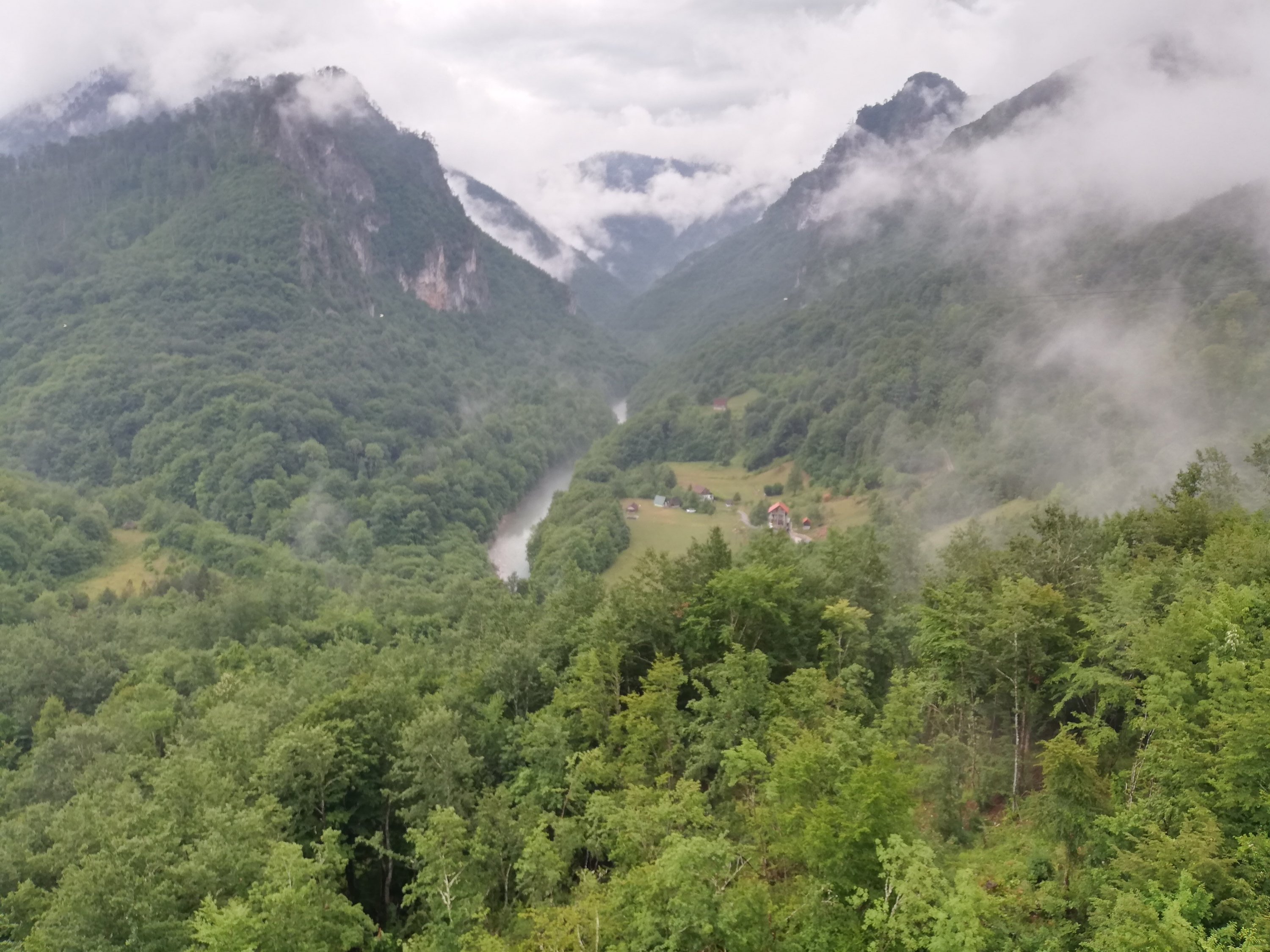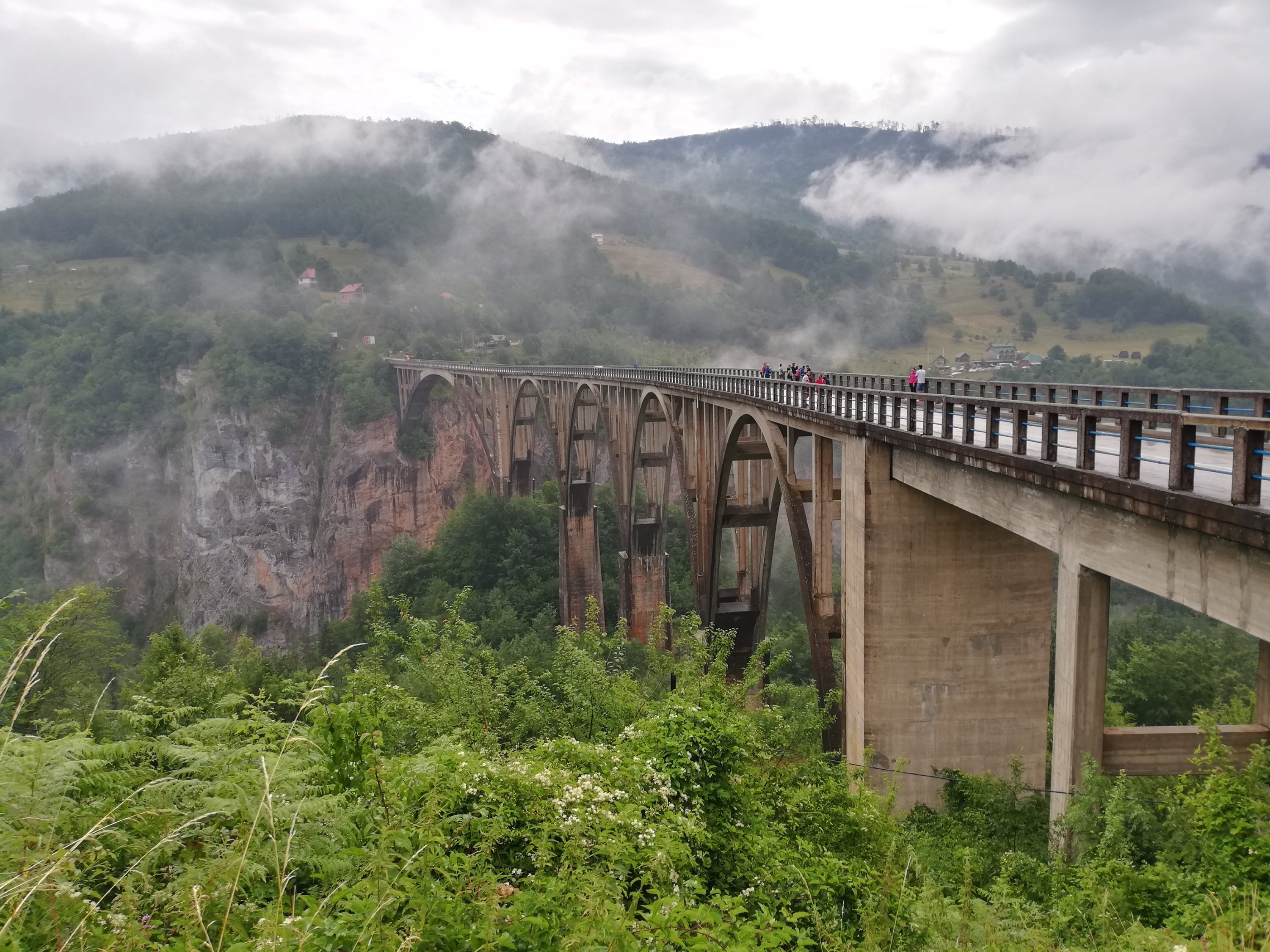 Nachdem wir gestern nicht mehr die Đurđevića-Tara-Brücke besichtigen konnten, haben wir uns diesen Programmpunkt für heute vorgenommen. Schon auf der halbstündigen Hinfahrt setzte aber der Regen ein und die Brücke war ganz in einen Nebelschleier gehüllt. Nach kurzer Wartezeit konnten wir aber ein paar Erinnerungsbilder knipsen und unseren Weg fortsetzen.