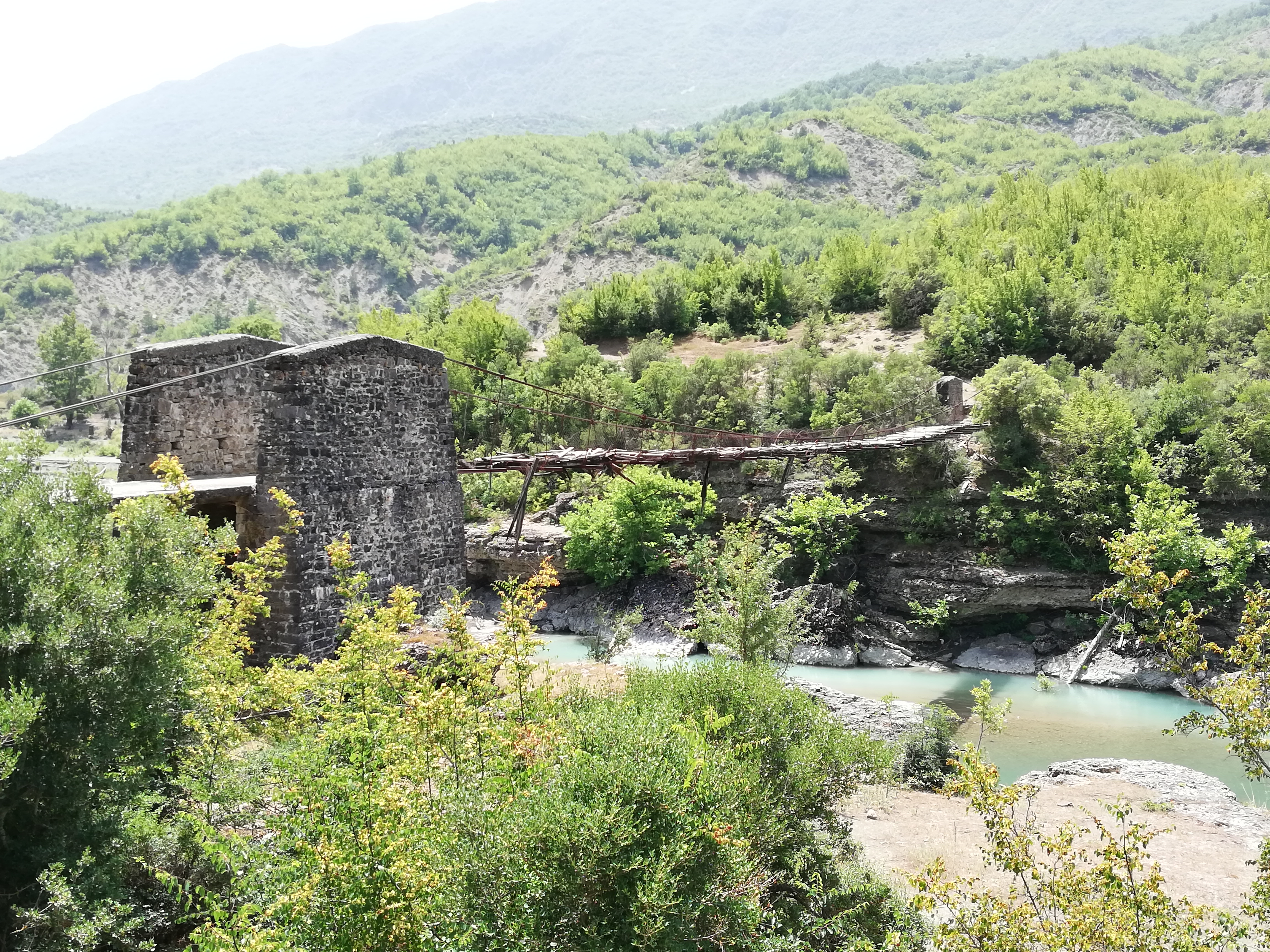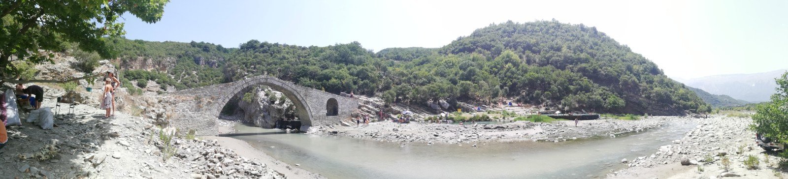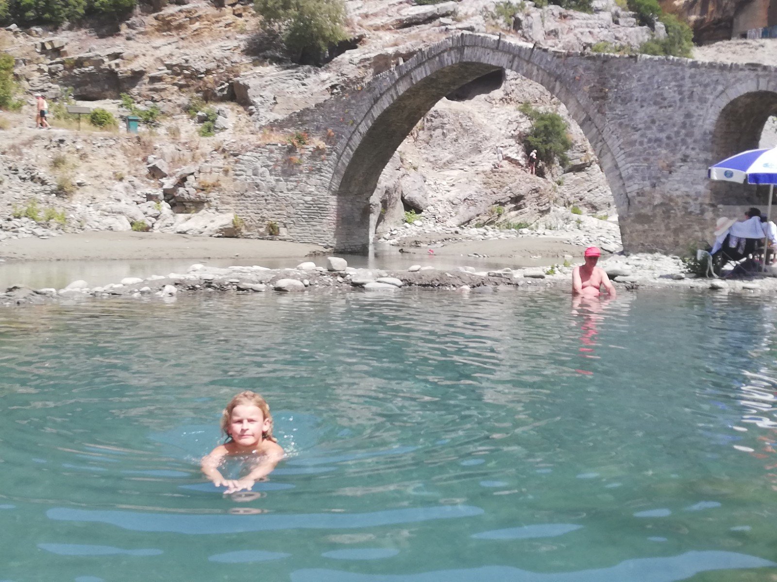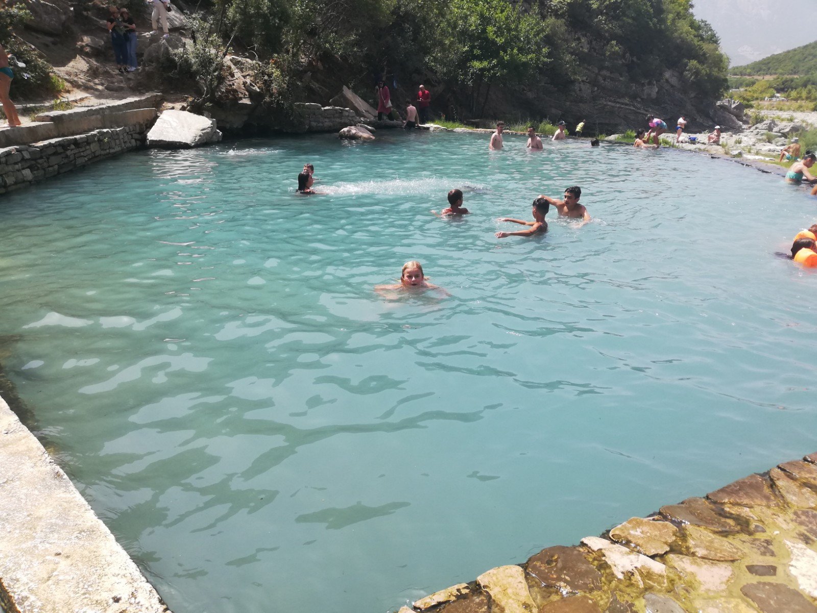 Unterwegs kamen wir an den Bënja Thermalquellen vorbei. Bei den sechs Quellen tritt bis zu 30 Grad warmes Wasser hervor, dem eine heilende Kraft zugesprochen wird. Die Bäder bestehen aus einfachen, ungeschützten Natursteinbecken. Die Quellen waren schon zur römischen Zeit bekannt. In der kommunistischen Ära gab es in Bënja einen Badetourismus von wenigen hundert Personen pro Jahr. Davon kann man aktuell nur träumen, denn leider verkommen die Quellen immer mehr zu einem Touristen-Hotspot. Ansonsten hätte dieser Ort für uns bestimmt auch seinen Reiz für eine Tag Aufenthalt gehabt. Emily aber war das egal und sie genoss – wohlgemerkt bei 39 Grad Außentemperaturen – die warmen Quellen.