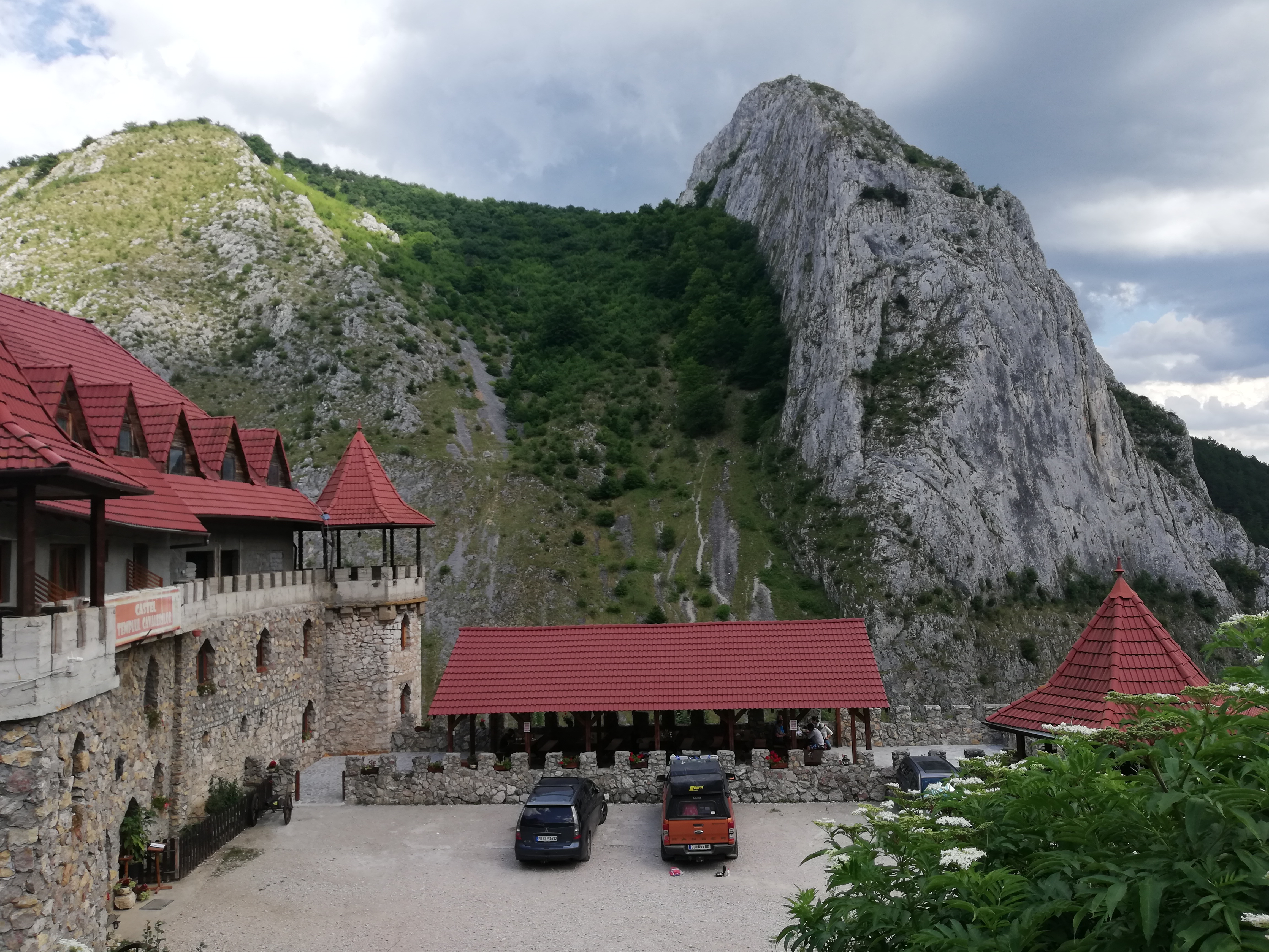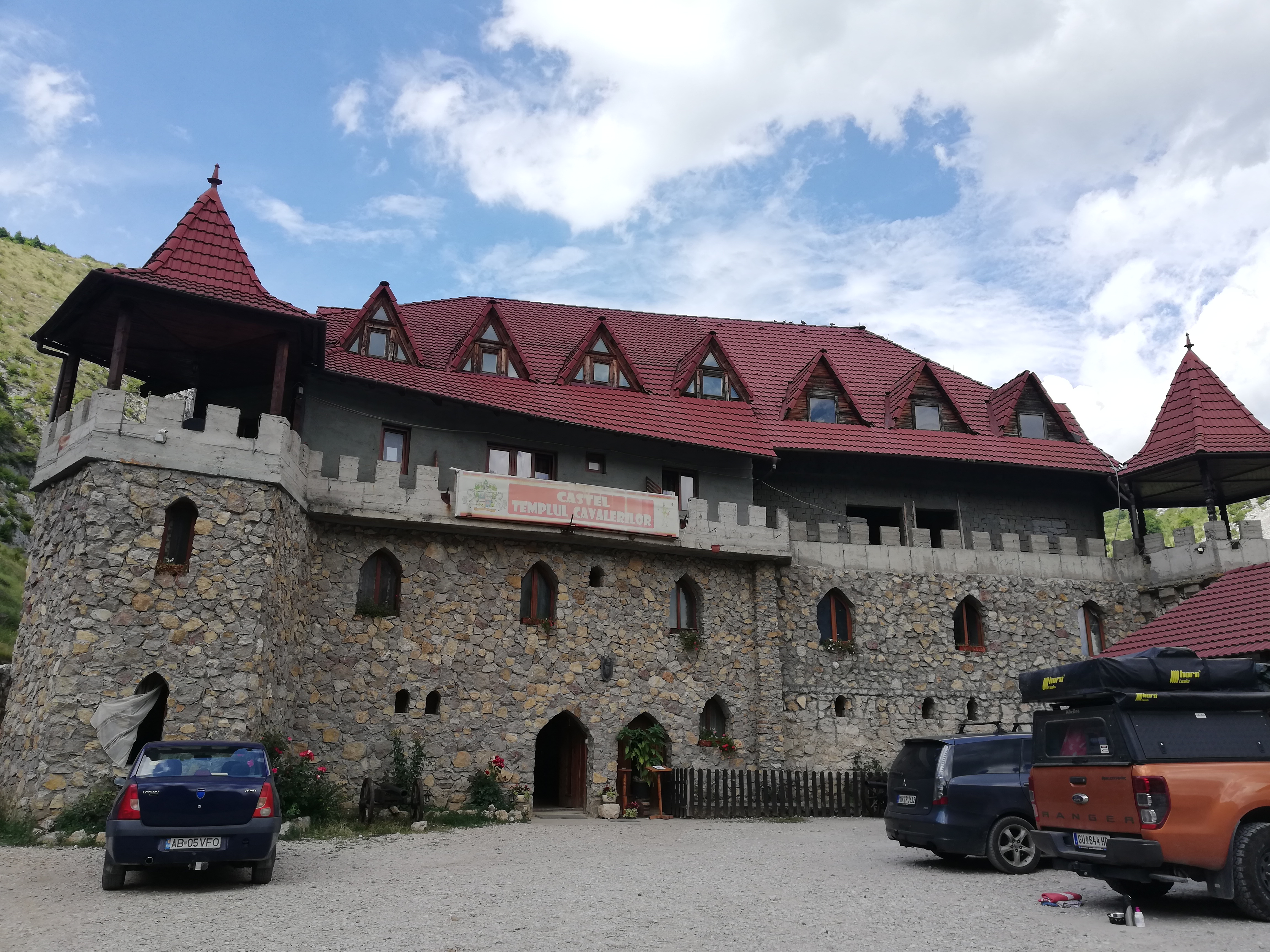 Bereits auf dem Hinweg zu unserem letzten Übernachtungsplatz kamen wir an einer von Bergen eingebetteten, mystisch aussehenden Burg, vorbei. Eine Recherche ergab, dass die Burg eigentlich ein Hotel mit angeschlossenem Restaurant ist. Inwieweit es sich um ein historisches Gebäude handelt, spuckte Google nicht aus. Jedenfalls wollten wir uns das näher ansehen um zumindest dort etwas zu Mittag zu essen.
