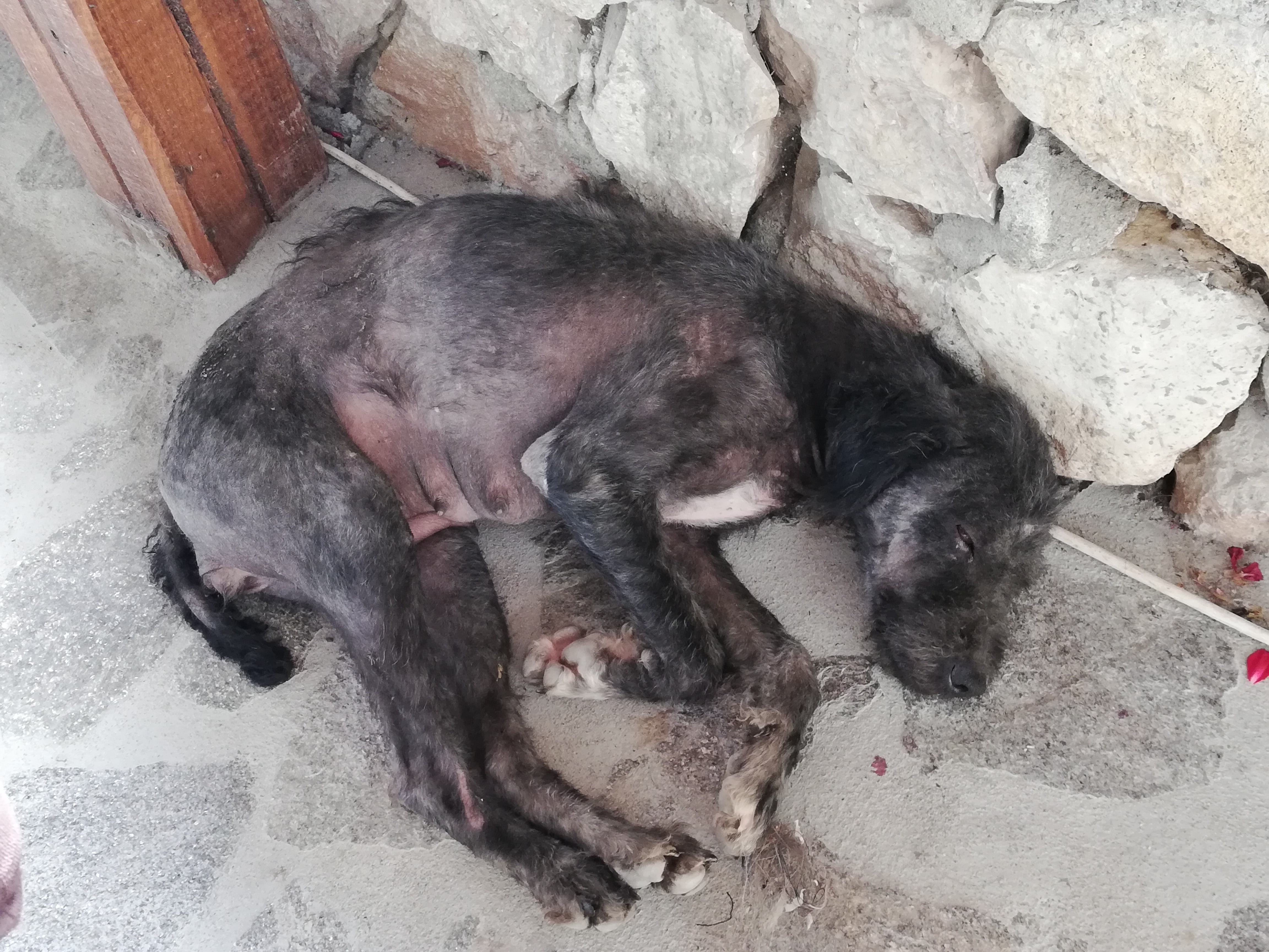 Jetzt war guter Rat teuer. Was machen mit der Hündin? Dass sie kürzlich Welpen bekommen hat und diese noch gesäugt hat, wurde von der Tierärztin bestätigt. Wobei diese aber vermutete, dass die Welpen nicht mehr leben, da sie sonst von der Hündin versorgt worden wären. Wir legten uns also auf die Lauer und durchsuchten nebenbei noch alle möglichen Plätze nach möglichen Welpen. Um wirklich sicher zu gehen haben wir uns für zwei Nächte in der „Burg“ ein Zimmer genommen. Zudem würde die Wirkung der Medikamente auch erst frühestens nach 24 Stunden einsetzen und eine Besserung wäre zu erkennen.